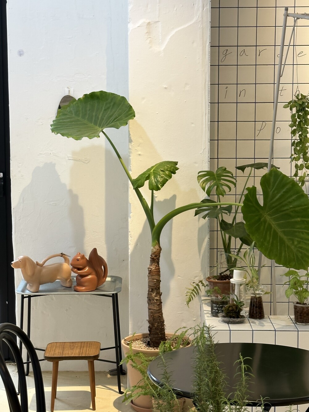 브라운 색으로 정원이나 실내 식물 옆이나
