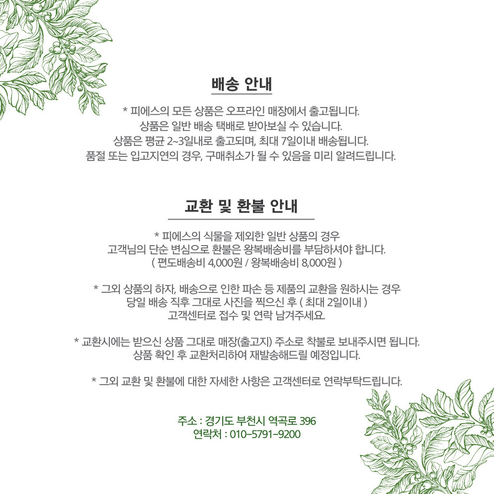 - 상품 하자, 오배송의 경우 수령일로부터 2일 이내 고객센터 접수 후 교환∙반품이 가능합니다. (교환/반품비 무료)
