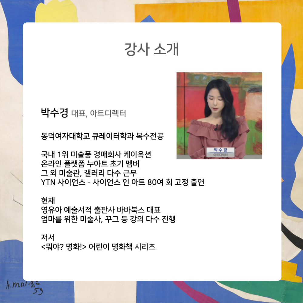 최근 ‘엄마를 위한 미술사’ 아카데미를 진행하며 예술이 부모와 아이의 일상 속 더욱 친근해질 수 있도록 돕습니다.