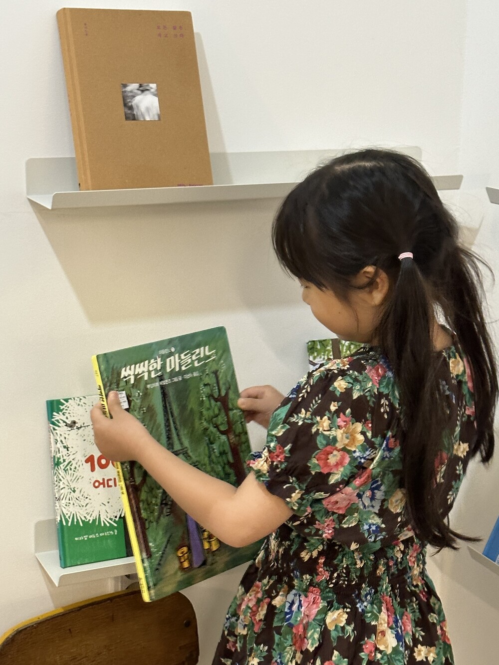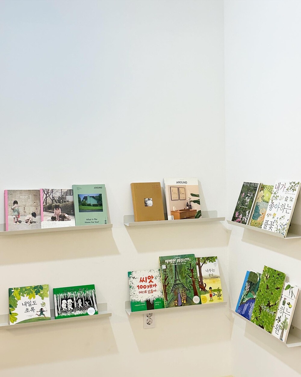 피에스아뜰리에에서 큐레이션한 다양한 그림책과 아트북,매거진 등이 북코너 선반에 전시되어 있어요.
