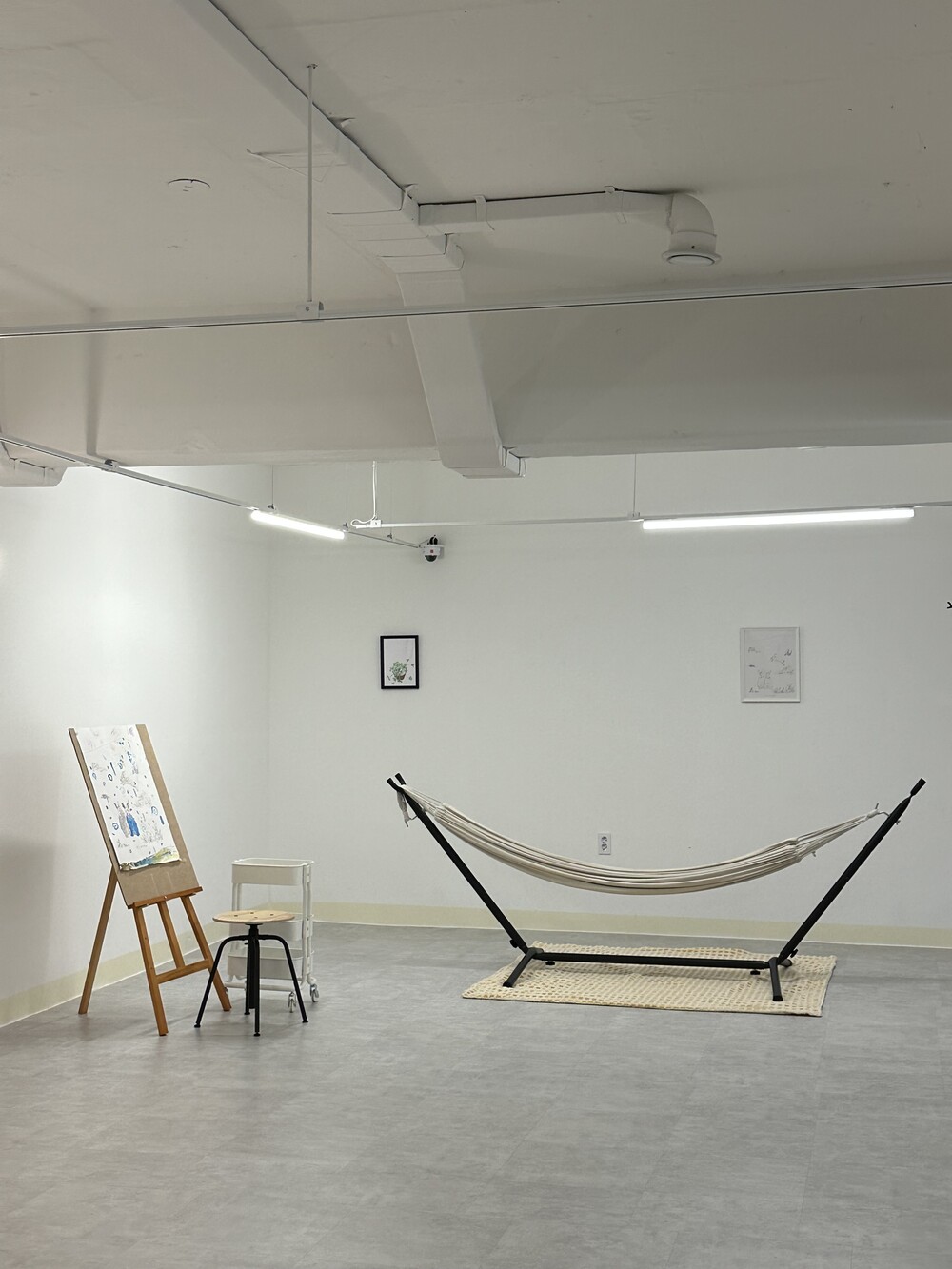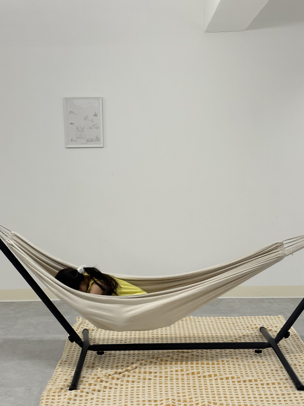 공간 이용시 자유롭게 책들을 보며, 해먹에서도 휴식을 취하고