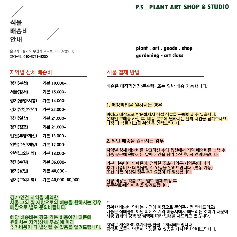 - 식물 배송은 소품/중품의 경우 위의 가격 안내를 참고부탁드리며, 대품 및 특수상황의 경우 추가 비용이 발생합니다. (전화문의)